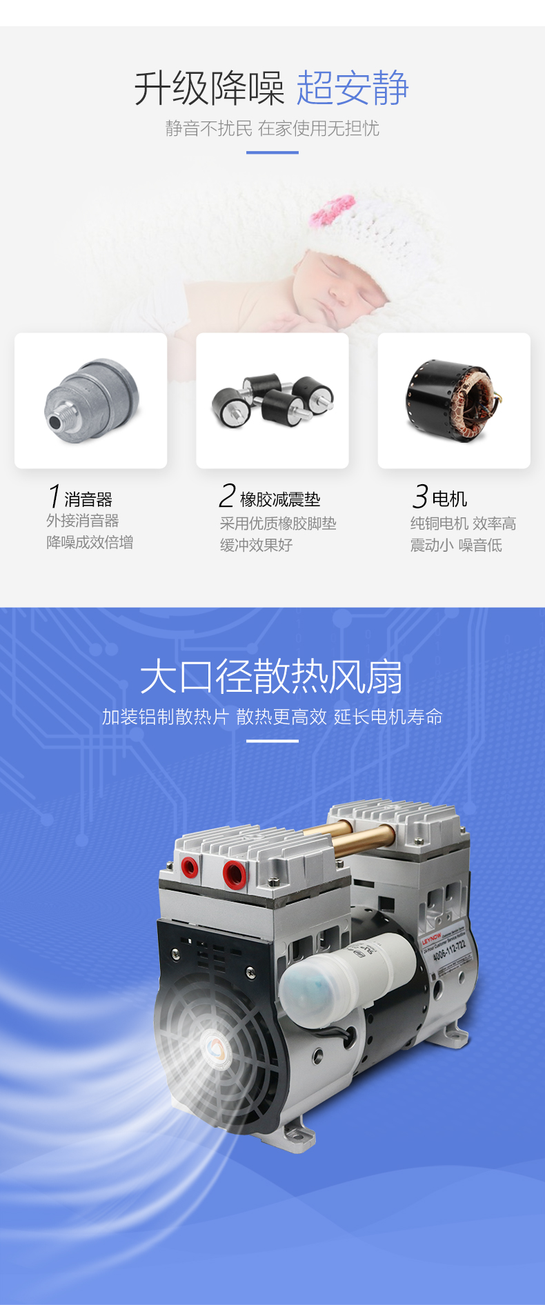Product Description:Ultra-low vacuum, ultra-low silent, lightweight, beautiful appearance, simple structure, easy maintenance, completely oil-free and easier to maintain.